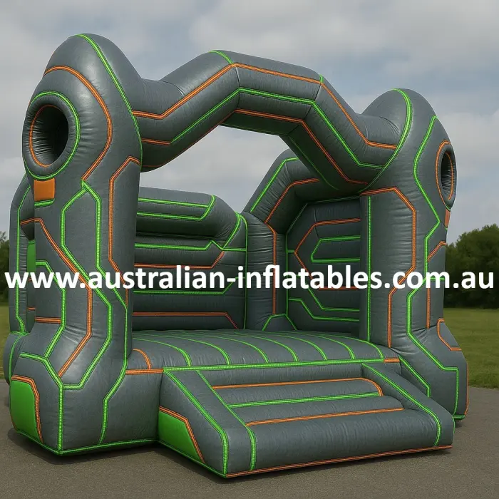 Take your next party, festival, or backyard bash to epic new heights with the Futuro Jumpo Jumping Castle! Designed with an innovative and futuristic look, this bouncing beauty will have kids and adults alike absolutely wrapped. Its sleek grey exterior with vibrant neon-green and orange accents gives it a space-age aesthetic that’s sure to catch eyes and get smiles.